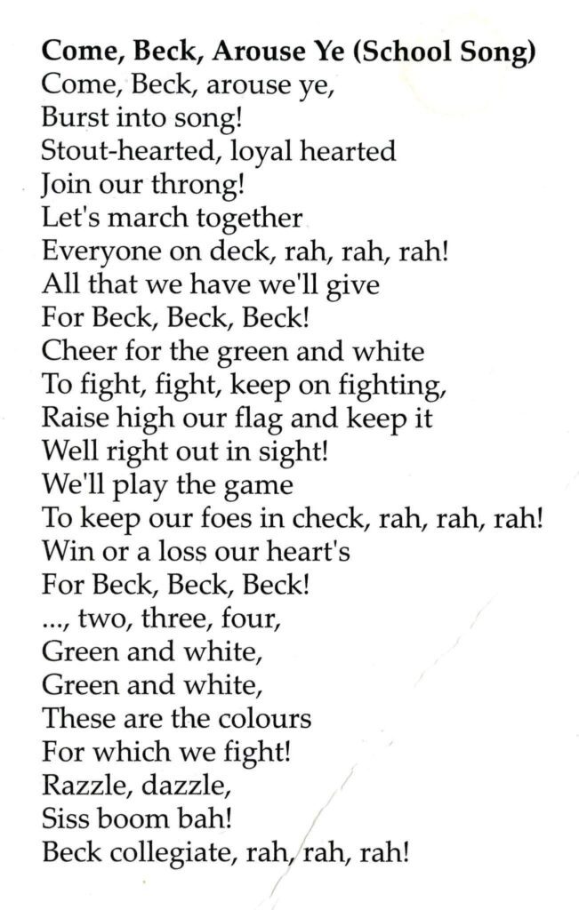 What made Beck so unique from what I came to learn then and over the years since my high school days, was its fostering of all dimensions in students. Athletics, despite the plethora of trophies in the front foyer, were no more important than music or drama or academic classes; the gestalt of Beck was that the whole school was very much more than the sum of its parts. We all knew the school song by heart and it was often chanted in auditorium pep-rallies led by the green and white clad all-female cheerleaders: